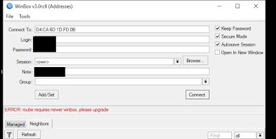 Lalu penulis mencoba lagi dengan memakai winbox versi 3.0rc6 nampak muncul pesan error yang mana ada klarifikasi bahwa untuk mengakses Mikrotik RouterOS versi 6.38 membutuhkan winbox terbaru dan diminta untuk upgrade winbox.