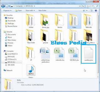 8. Untuk memastikan proses tersebut sudah berjalan dengan benar, buka windows explorer flash disk anda, caranya klik icon windows explorer atau tekan tombol kombinasi Windows + E, lalau klik drive flash disk anda dan pastikan ada file userkey.psw, kurang lebihnya menyerupai ini :